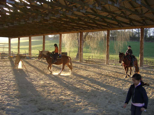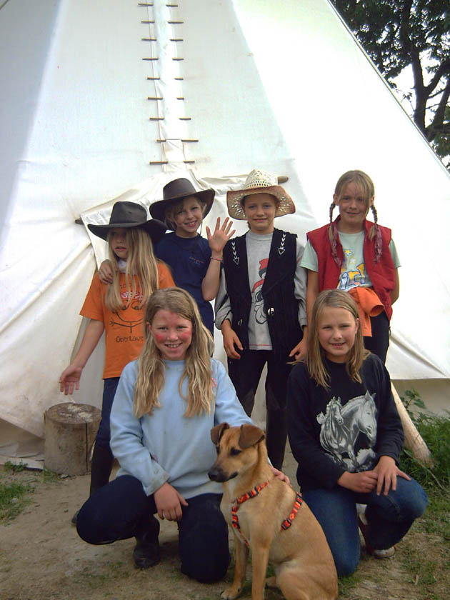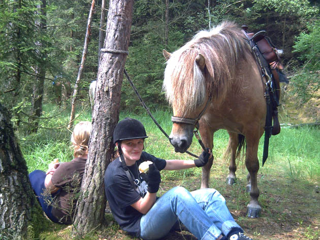 Abenteuertauglichkeit will geübt sein… Wer ein echtes Abenteuer erleben will braucht das richtige Pferd, die passende Ausrüstung und das nötige Know how. Vom Halfter anziehen bis zum Geländeausritt in der Gruppe… wir zeigen euch wie´s geht. Die Sicherheit spielt im Umgang mit Pferden eine wichtige Rolle, sowohl für den Mensch als auch für das Tier. Deshalb könnt ihr alles was ihr lernt direkt an und mit unseren Pferden umsetzen. Wir fangen beim Aufhalftern an, lernen wie man ein Pferd richtig führt, reiten zuerst ohne Sattel und probieren allerhand Sachen aus (z.B. wie das mit dem Gleichgewicht so ist). Im Freizeit- und Westernstil geht´s auf dem Reitplatz und dann im Gelände weiter. Bei der Wildwest Foto Aktion könnt ihr euch als wilde Cowboys, Cowgirls oder Indianer mit den Pferden fotografieren lassen. Am Lagerfeuer erzählen wir uns alte und neue und wahre und vielleicht nicht so ganz wahre Geschichten. Für die Übrige Zeit und falls das Wetter uns ganz und gar einen Strich durch die Rechnung macht, haben wir noch einiges auf Lager z.B. gibt’s Filme, Spiele, unser gemütliches Reiterstübchen (mit Fernseher, Video und DVD). Außerdem könnt ihr vom Hufschmied persönlich was über Hufpflege erfahren und z.B. mit zuschauen wenn ein Pferd beschlagen wird. Also langweilig wird’s bestimmt nicht. |